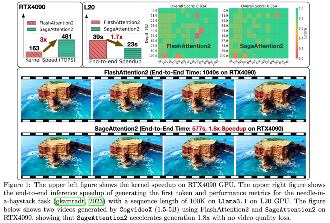 SageAttention 实现了底层的 GPU CUDA Kernel,在算子速度以及各个模型端到端准确度上都有十分不错的表现。