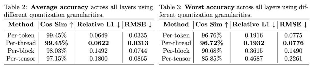 如下表所示,可以发现 per-thread 量化的准确度比 SageAttention 中采用的 per-block 量化高得多,准确度和 per-token 量化几乎没有差别。