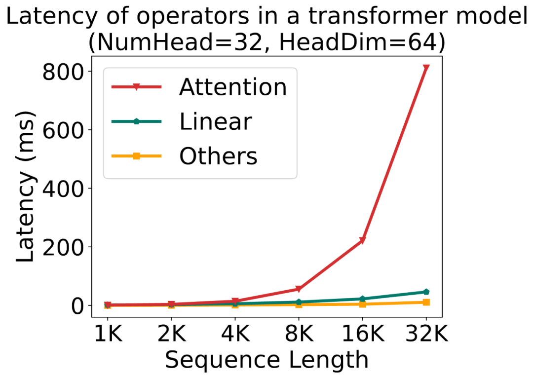 随着大模型需要处理的序列长度越来越长,Attention 的速度优化变得越来越重要。下图展示了一个标准的 Transformer 模型中各运算的时间占比随序列长度的变化: