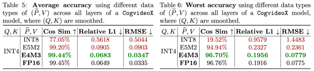(4)针对 P 和 V,研究团队对比了多种量化的数据类型,对比发现使用 E4M3 数据格式的 FP8 精度最准确,基本接近了 FP16 的准确度。因此采用将 P 和 V 量化至 E4M3。