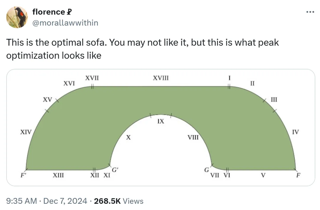 2024 年 12 月 2 日,韩国学者 Jineon Baek 发表了一篇新论文,声称证明了 Gerver 确实是正确的 —— 他的沙发是最优的。这项研究在社交媒体(如 x)上的热度非常高,引起了很多人的关注。