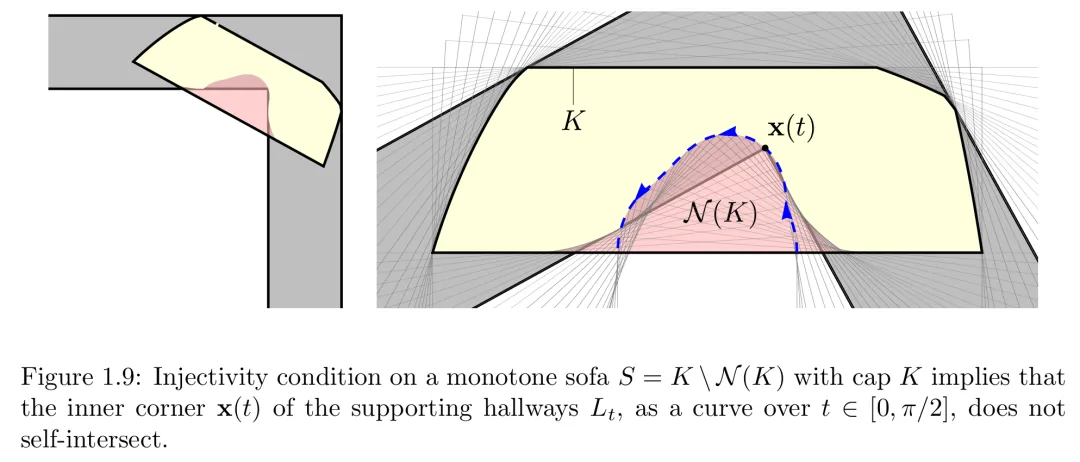 这个问题之所以很难,是因为没有一个通用的公式可以计算所有可能的移动沙发面积。因此,为了解决这个问题,作者证明了最大面积的移动沙发 S_max 的一个属性,被称为可注入性条件(injectivity condition)。