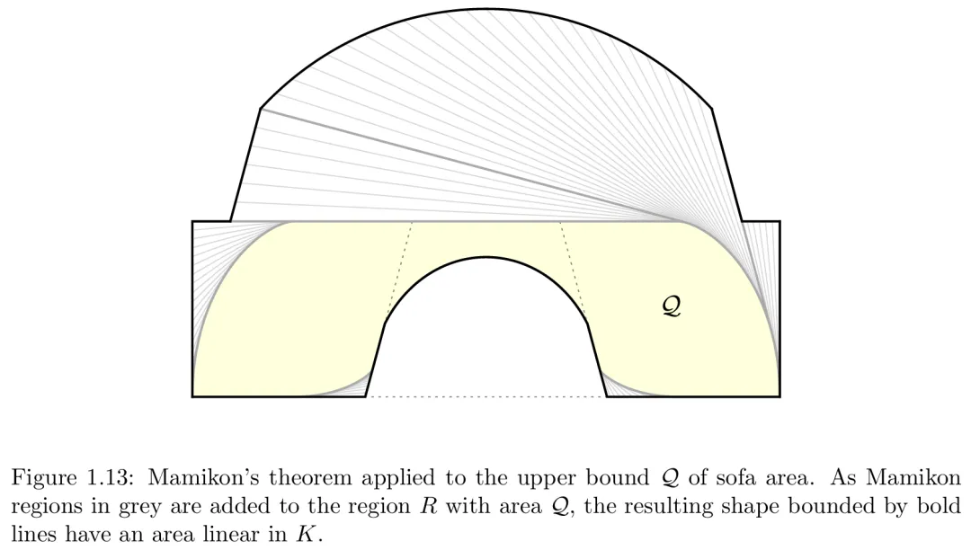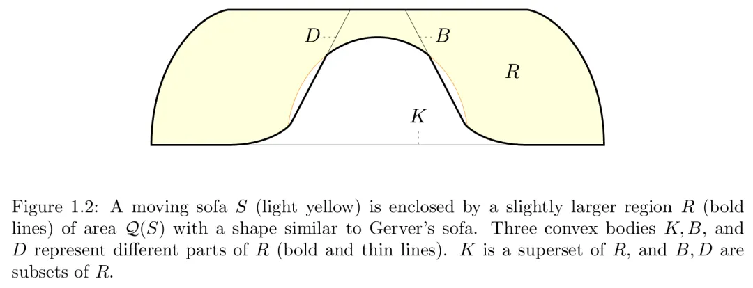 然后,移动沙发 S 面积的上界 Q (S) 相对于 S 的最大值如下所示:作者使用 Brunn-Minkowski 理论将 Q 表示为凸体元组 (K,B,D) 空间 L 上的二次函数(上图 1.2),并使用 Mamikon 定理建立 Q 在 L 上的全局凹性(下图 1.13)。