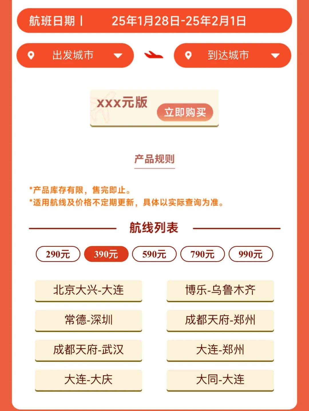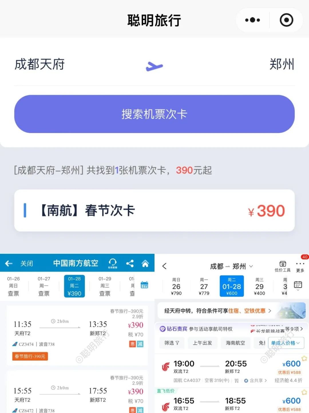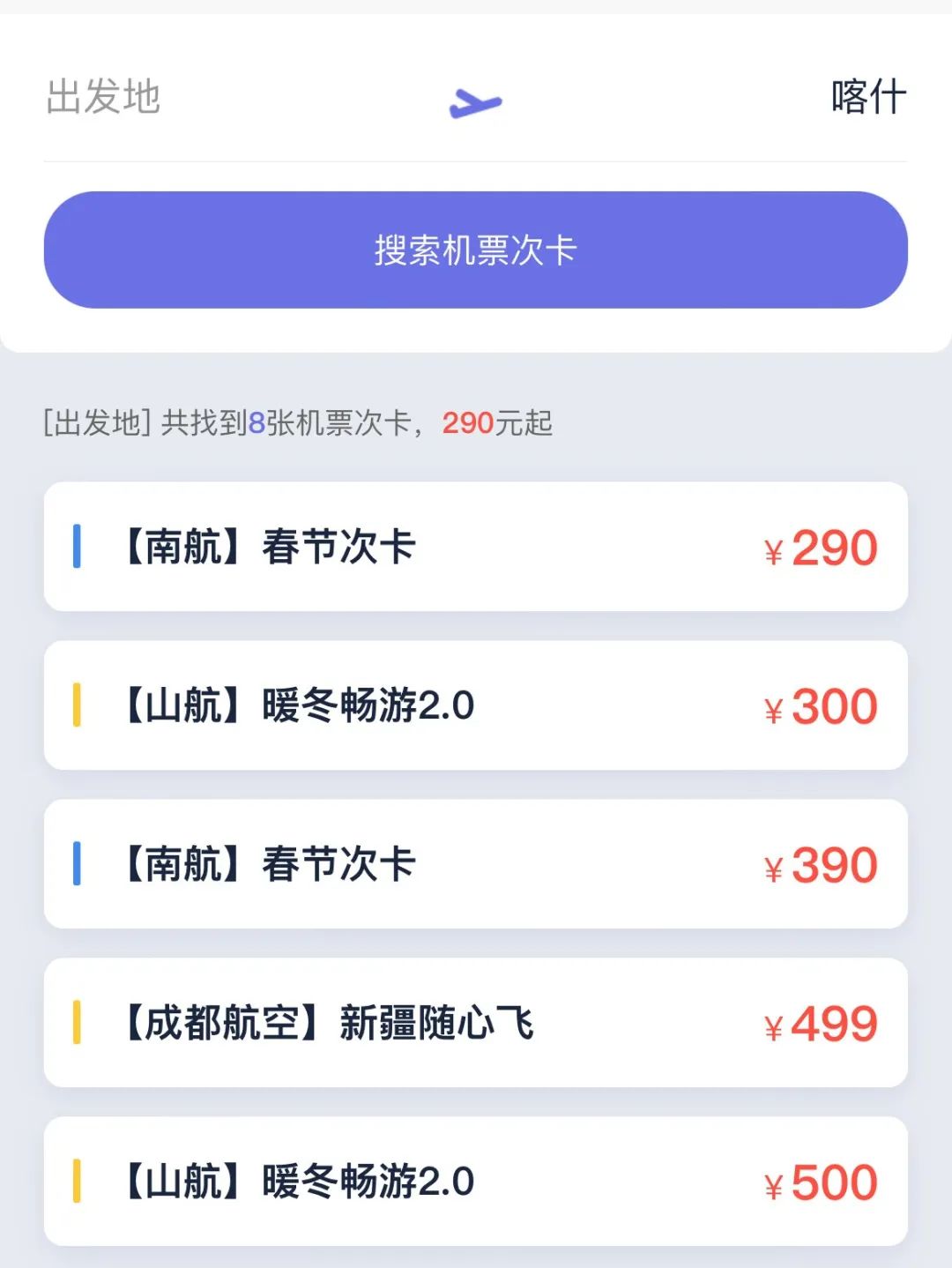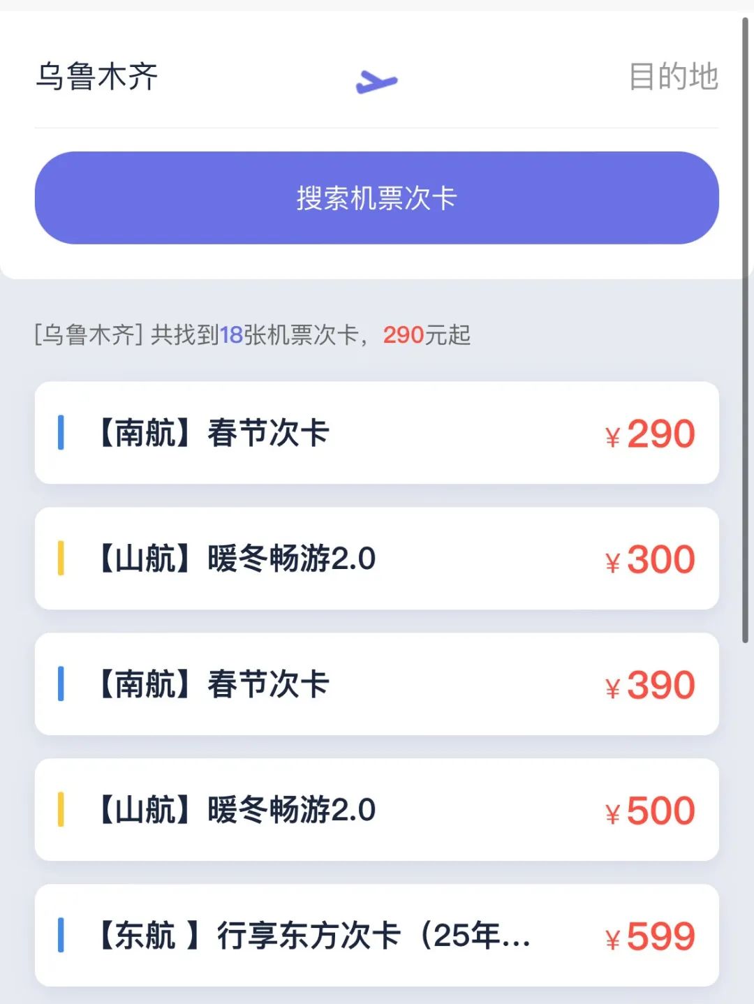 南航新推出春节期间(1月28日至2月1日,即大年三十至正月初四)的机票次卡,价格从290元至990元不等,涵盖众多航线。