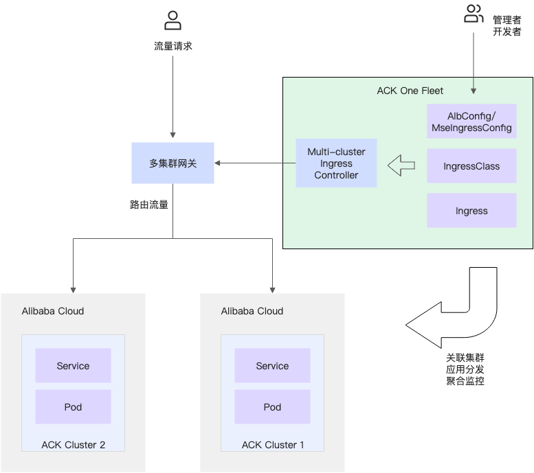 随着云原生技术在各个领域的不断推广与应用,单一集群越来越难以满足容灾和高可用方面的需求,在碰到集群基础组件升级故障或可用区级别故障时往往难以快速进行服务恢复;在这样的背景下,ALB Ingress支持在分布式云容器平台ACK One提供的多集群舰队模式下支持多集群网关能力,ACK One舰队管理的Fleet实例是由ACK托管的,可以管理任意环境的Kubernetes集群,为企业提供一致的云原生应用管理体验。