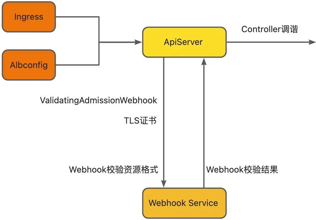 在 K8S v1.9版本 中,kubernetes 的动态准入控制器功能中支持了 Admission Webhooks,用户可以以插件的方式对 ApiServer 的请求进行访问控制,ApiServer 会在请求通过认证和授权之后、对象被持久化之前拦截该请求,并调用 Webhook 服务达到准入控制。2.15.0版本ALB Ingress Controller 支持了Webhook校验服务,对比调谐时发现配置错误问题并返回失败事件,Webhook校验有如下几点优势: