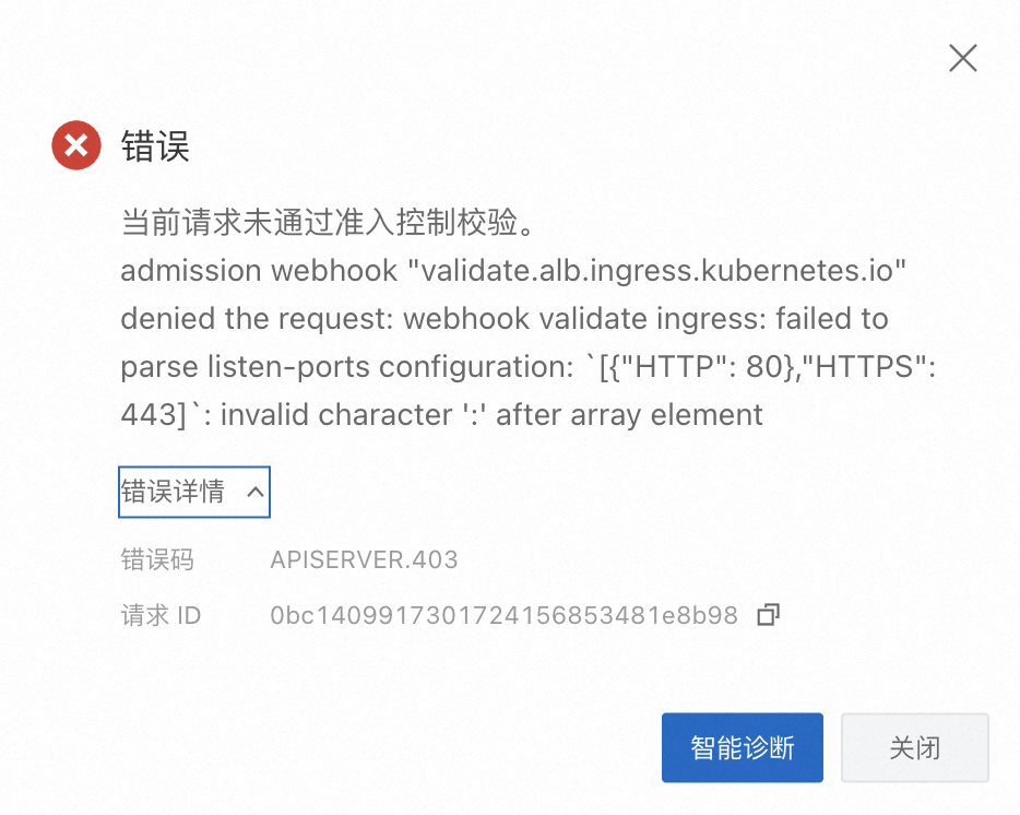 以如下ingress配置为例,在ACK控制台配置ingress时,listen-ports注解项配置错误,Webhook校验服务会发现注解项中错误的配置并直接返回报错,便于用户感知错误配置并及时修改。