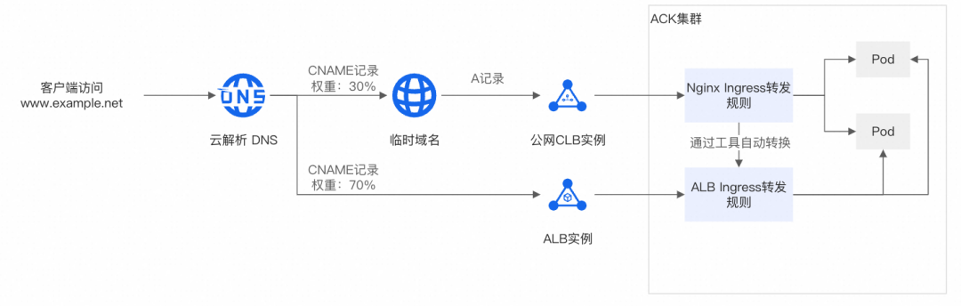 通过DNS的方式,来将流量灰度到ALB上,可以确保流量正常的情况下具备恢复和容灾能力,具体到转发工具上,目前推送了工具镜像到官方仓库中,用户可以使用如下的Job来进行一次性转换工作,也可以以工具容器的形态长期运行,在功能进一步完善后会以更加通用的方式进行工具发布。