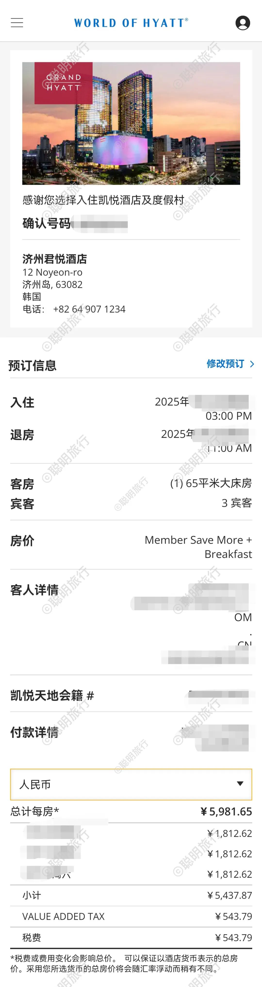 比如群友 @ddh 的济州岛君悦,预订、跟单、返现,退房后直接转账599,其他的会员待遇、SNP该有的都有。