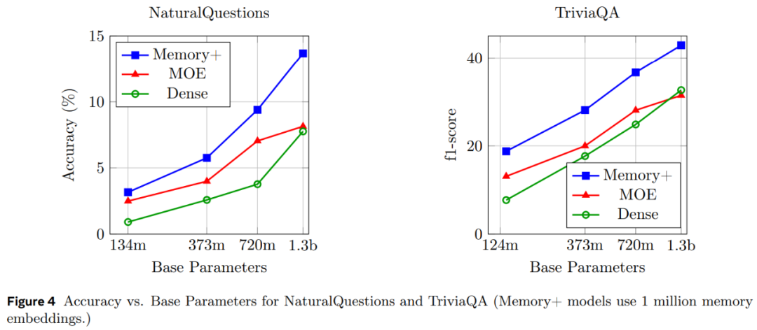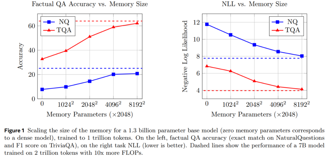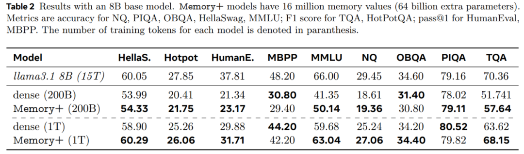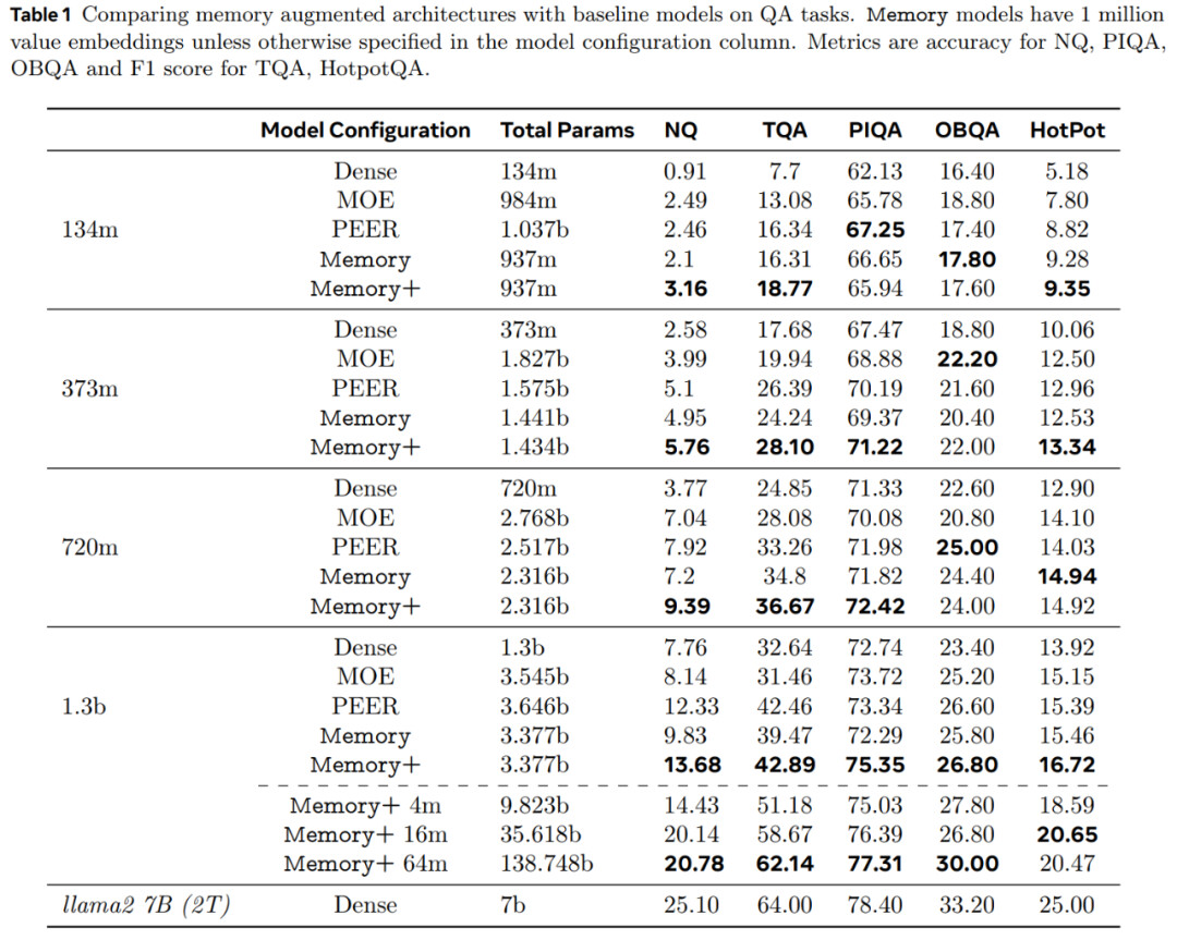 实验结果表明,在各种基准测试中,具有记忆层的模型在性能上优于参数规模更大的密集模型以及计算和参数规模相当的专家混合(MoE)模型。例如,一个 13 亿参数且包含 6400 万键(1280 亿记忆参数)的记忆模型的性能接近于 70 亿参数的 Llama2 模型,而后者的计算量是前者的 10 倍以上。这表明,记忆层为 LLM 的扩展提供了一条高效且高性能的途径。