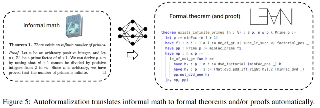 相比之下,非形式化数学是指教科书、研究论文和在线数学论坛中常见的数学文本。非形式化数学会将自然语言与符号(例如 LATEX)交织在一起,但这些符号没有自我包含的形式语义,而是依靠非形式文本来传达其含义的重要部分。