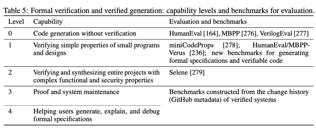 研究团队最新发现,把 AI 应用到程序验证和系统开发时,面临的挑战与数学研究有很大不同。为了更好地理解这个领域,该团队设计了一个 4 级能力评估体系 (表 5)。
