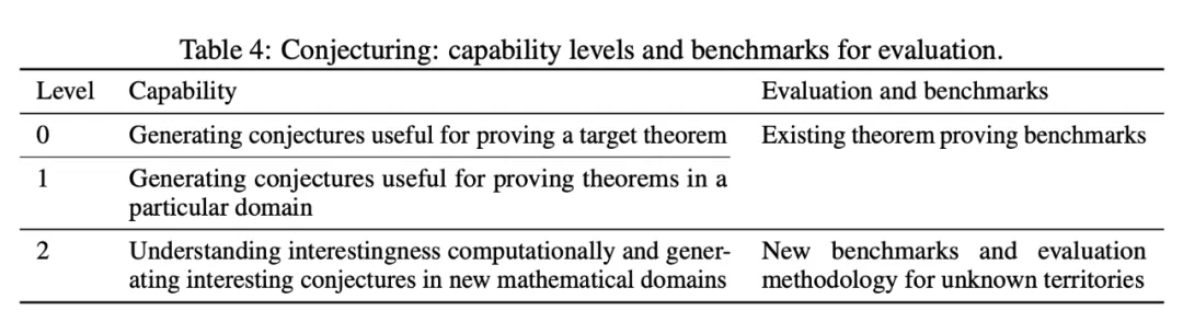 根据表 4 的分级标准,0 级水平是指 AI 能够针对特定问题或目标结果提出相关猜想。更进一步,在 1 级水平上,AI 就预计可以在给定研究领域内自主提出猜想,而不必局限于某个具体定理了。