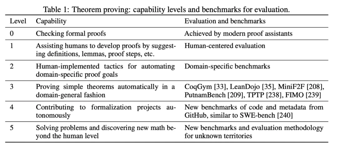 研究团队根据表 1 给出了 AI 形式定理证明的分级基准。