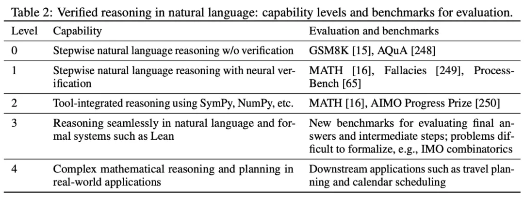 虽然推理过程可能不是严格的形式化证明,但其中的部分内容仍可以在人工的监督下以半自动化的形式验证。该团队将这种能力称为「自然语言验证推理」,并提出了一个分级框架 (表 2)。