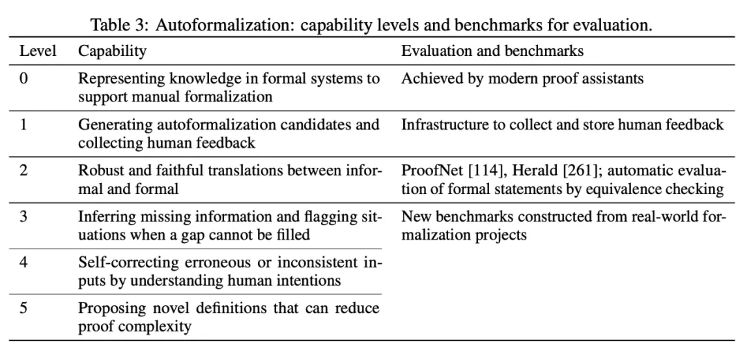 根据表 3,在最基础的 0 级水平,AI 系统能够存储和检验形式化知识,方便人工形式化。