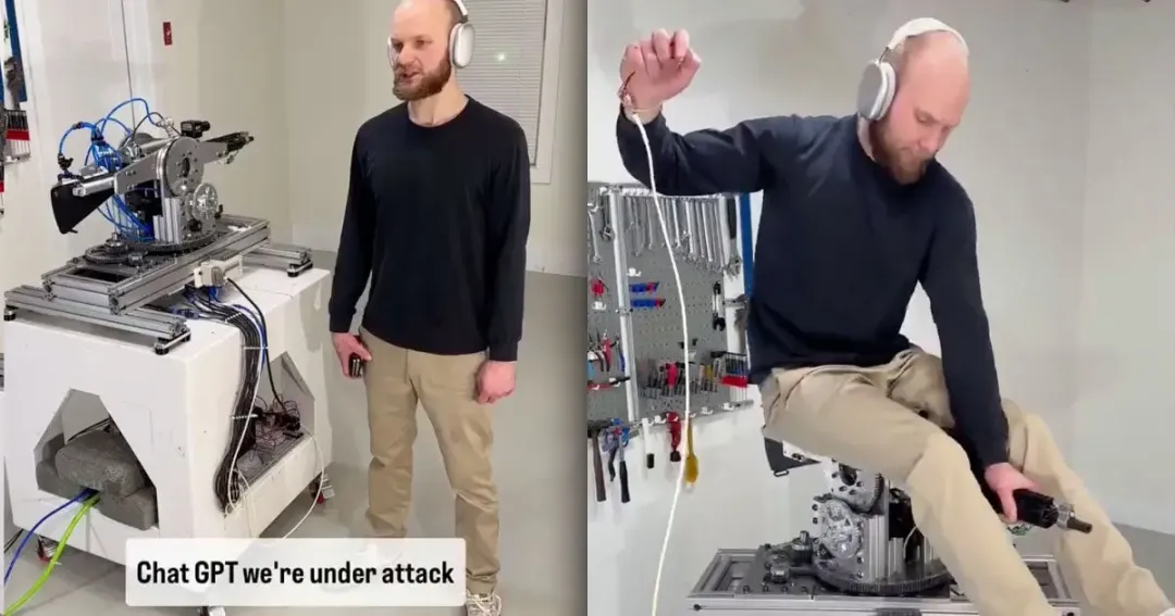 视频中,这位发明者站在洗衣机大小、与步枪连接的组件旁边,若无其事地对系统下达指令称“ChatGPT,我们正受到来自左前方和右前方的攻击,立即做出相应反应。”这把步枪则毫不犹豫开始行动,瞄准附近墙壁、向左右两个方位倾泻出了类似空包弹的猛烈火力。