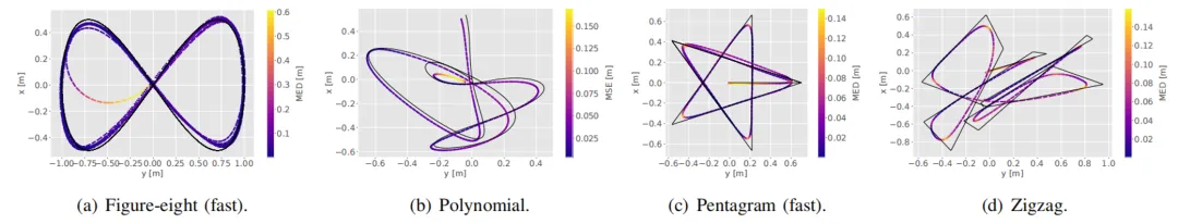 平滑轨迹:包括八字形和随机多项式轨迹。八字形轨迹具有周期性,研究人员测试了三种速度:慢速 (15.0s 完成)、正常速度 (5.5s 完成) 和快速 (3.5s 完成)。随机多项式轨迹由多个随机生成的五次多项式段组成,每个段的持续时间在 1.00s 和 4.00s 之间随机选择。