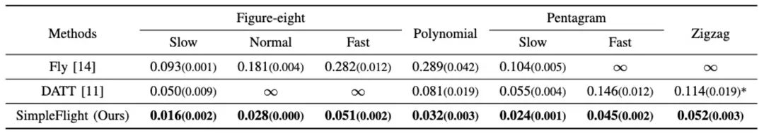 研究人员在Crazyflie 2.1和自制250mm轴距四旋翼无人机上进行了实验,结果表明SimpleFlight在各种轨迹,包括平滑和不可行轨迹上,都取得了最佳性能,且无需额外微调。
