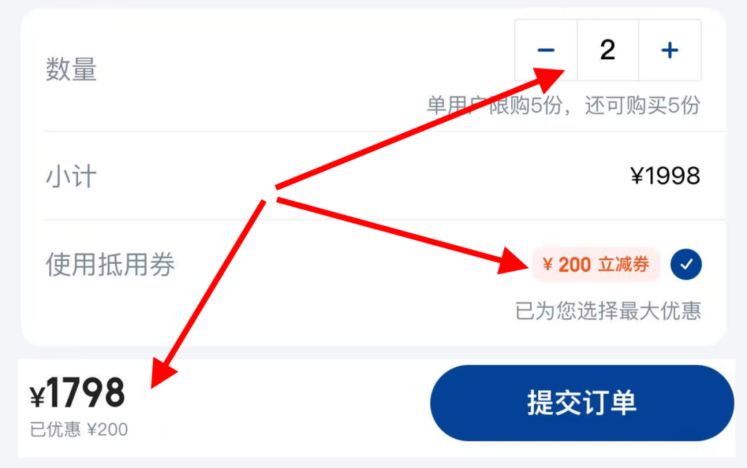 比如下面的,某款酒店套餐是999元,买2份刚好凑上1998-200元的优惠券。