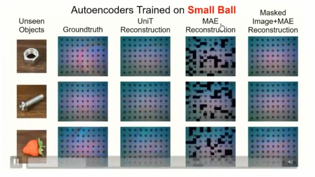 第二个是 Small Ball 实验。如下图所示,虽然训练数据仅来自 Small Ball,且重建效果不如 Allen Key,但模型仍能一定程度上重建复杂物体的原始信号。