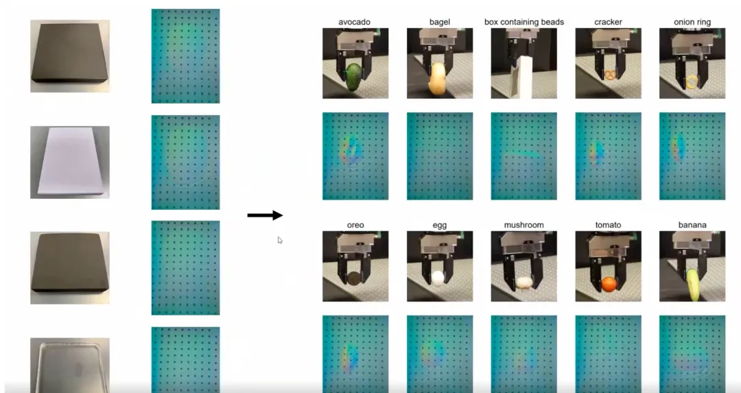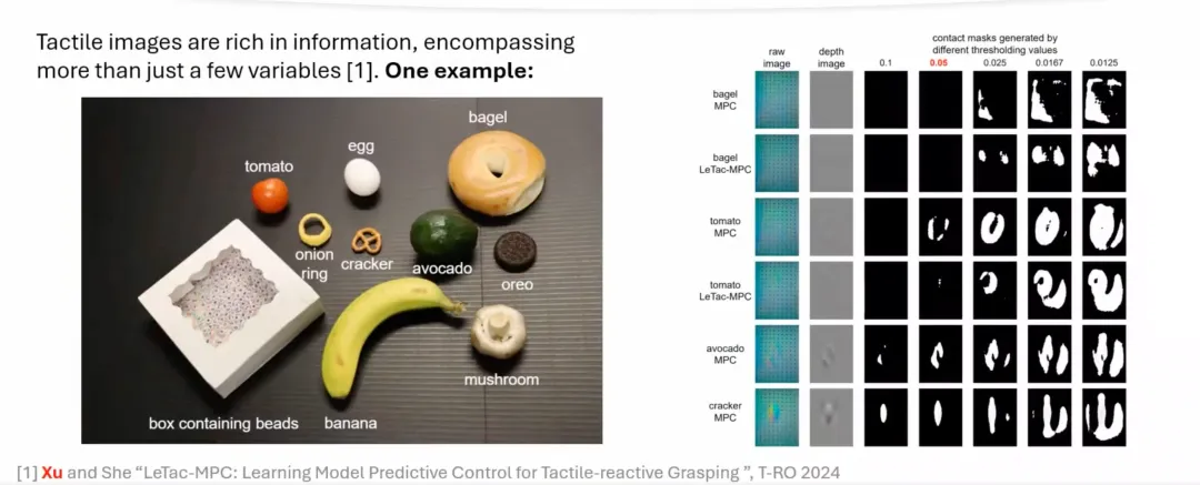 然而,基于模型的控制器存在一定局限性,难以泛化到现实生活中大多数日常物体。这主要源于建模过程中的简化假设,这种简化和假设往往对一些现实物体无法起作用。如下图所示,对于软物体或形状复杂的物体,难以通过简单的阈值设定精确提取接触面积;而对于牛油果、饼干这种比较硬的物体,其触觉信号 (tactile image) 较强,就可以精确地提取接触面积。
