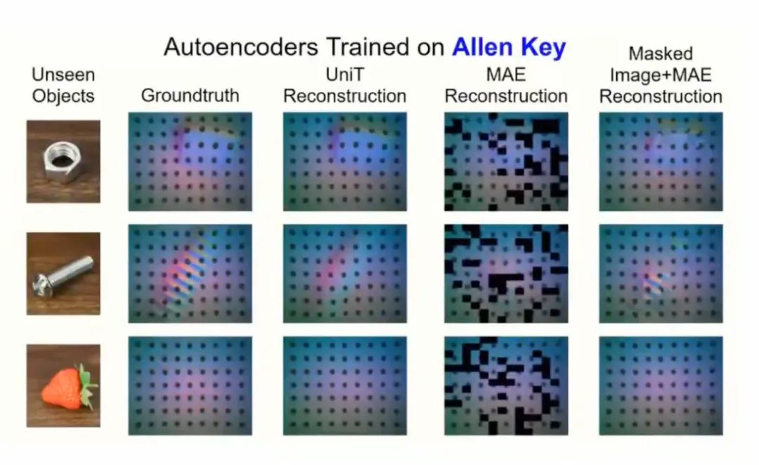 首先是 Allen Key 实验。如下图所示,尽管训练数据仅来自 Allen Key,但我们依然可以通过 latent space 重构出未见物体的原始图像,说明该 latent space 包含了绝大多数原始图像的有用信息。与 MAE 对比时,我们发现 MAE 很难准确重构原始图像,这表明在解码过程中,MAE 可能存在信息损失。