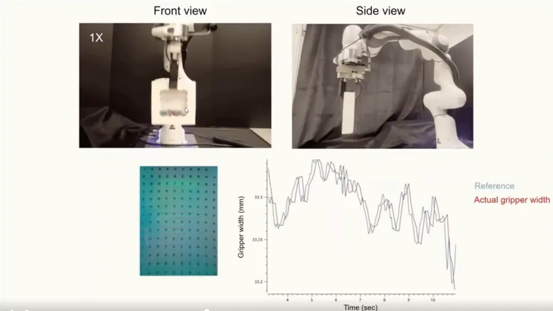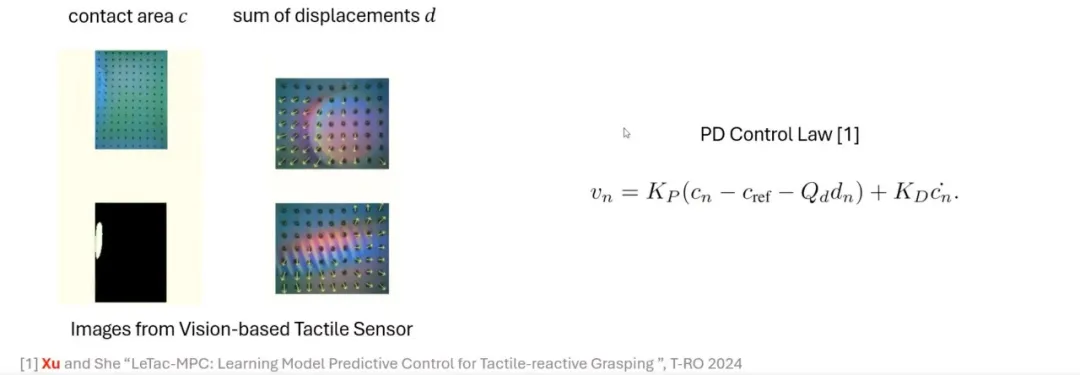 此外,利用光流 (optical flow) 技术追踪标记点 (marker) 的移动,还可以获得另一个重要量:位移 (displacement),这一量与侧向力相关。结合这些信号,我们可以构造基于比例-微分 (PD) 控制器的控制方法,实现触觉反应式抓取(tactile-reactive grasping)。