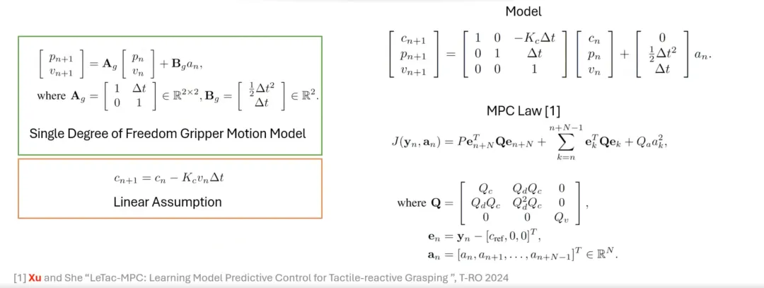 除了 PD 控制器,我们还设计了基于模型预测控制器 (MPC) 的抓取方法。MPC 的控制目标与 PD 控制器类似,但其特点是基于线性假设和 Gripper 模型。例如,先引入线性假设 (Linear Assumption) 和单自由度夹持器运动模型 (Single Degree of Freedom Gripper Motion Model),然后将二者统一建模,最终构造出基于 MPC 的控制律 (control law)。