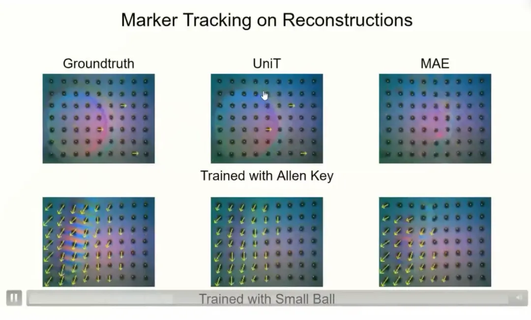 此外,latent space 不仅捕捉了触觉几何信息(如形状和接触构型),还隐式包含了标记点的移动信息。例如,通过对原始图像和重建图像的标记点追踪,我们发现二者在 Marker Tracking 上的表现非常接近。