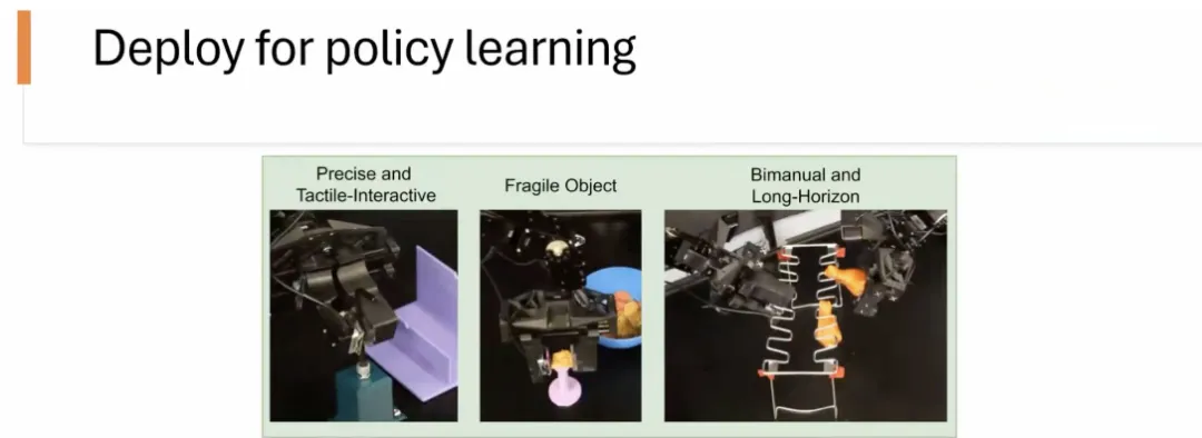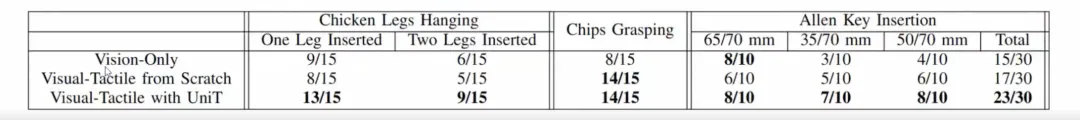 我们进一步将触觉表征应用于策略学习 (policy learning) 实验,验证其在复杂任务中的表现。实验使用了 Allen Key 数据进行训练,并评估了以下 3 项任务: