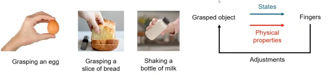 * 当抓取一个鸡蛋时,我们感知到鸡蛋坚硬但脆弱,因此会使用适当的力避免损坏。当手指反馈压力增大时,我们会减弱抓取力度。