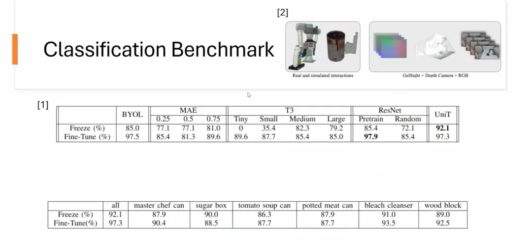 其次,我们也做了 classification benchmark(分类基准)。数据集来源于 CMU 的 YCBSight-Sim。虽然数据集较小,但 UniT 在分类任务中展现了良好的性能。尤其是在单一物体上学习触觉表征后,能够自然泛化到其他未见物体的分类任务。例如,仅在 master chef can 上训练的表征,可成功应用于 6 种不同物体的分类,并取得优异效果。部分单一物体训练的表征甚至超过了大量物体训练的表征性能。
