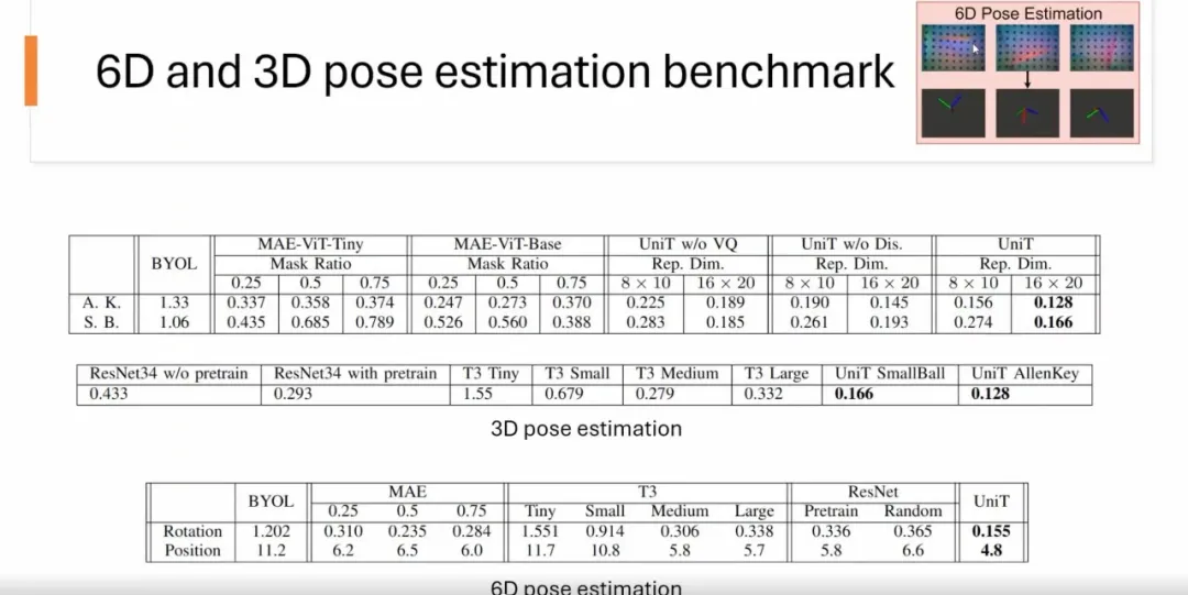 对于 6D pose estimation(姿态估计),我们输入了一张触觉原始图像(如 USB 插头的触觉图像),来预测其位置 (position) 和旋转 (rotation)。结果表明,与 MAE、BYOL、ResNet 和 T3 方法对比,UniT 模型在准确性上优于其他方法。