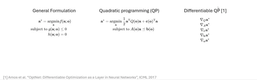 在此基础上,我们引入「可微分」(Differentiable) 的概念。所谓可微分,指的是在神经网络中,一个层的输出可以对其内部参数进行偏导数计算。引入可微分二次规划 (Differentiable QP) 的意义在于,当我们希望在神经网络中添加一个优化层时,必须确保该层是可微分的。只有这样,优化层的参数才能在网络训练与推理过程中通过梯度信息自然更新和流动。因此,如果我们能让二次规划问题变得可微分,就能够将其融入神经网络,使之成为网络的一部分。