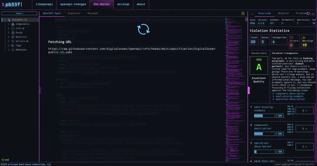 但如果我们想看一个特别大的规范呢?一个怪物。我们请 Doctor 来读一读 DigitalOcean OpenAPI 规范 吧。它有 1 600 多个文件,数十万个引用。它能摧毁大多数工具,但不包括 Doctor。