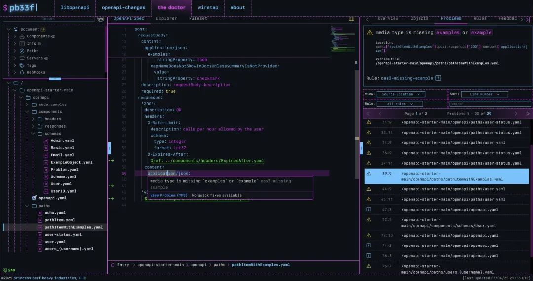 然后,它会打开 rolodex 面板,显示构成 OpenAPI 规范的整个文件系统。文件夹可以展开,文件可以点击,问题或参考资料都可以立即显示出来。