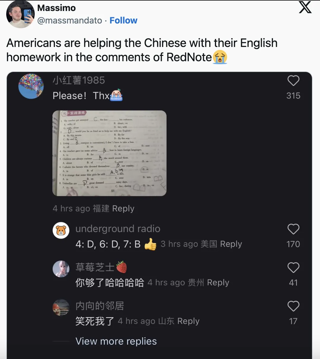 小红书社区的氛围也震惊了新入驻的 TikTok 老用户,有已经上手小红书的国外网友在 X 上发文称,“美国人正在小红书上帮中国学生写作业呢!”这是因为有小红书国内用户在平台上发了一张英文卷子急求美国用户帮忙作答。