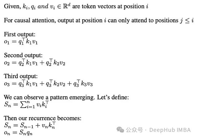 为什么这种转换在线性注意力中可行而在softmax中不可行呢?这是因为softmax函数本质上不可分离,无法分解为独立项的乘积。在解码阶段,由于只需要维护d × d维度的状态矩阵S_(n-1),每个token的生成复杂度仅为O(d²)。