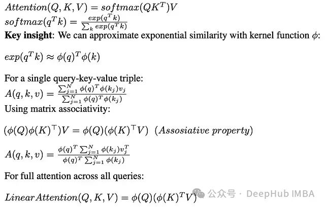 Katharopoulos等人提出了一种创新性的解决方案,他们通过将softmax指数函数重写为特征映射φ(x)的点积形式的核函数,并利用矩阵乘法的结合律,成功将注意力计算重构为线性形式。这一转换过程如下图所示:
