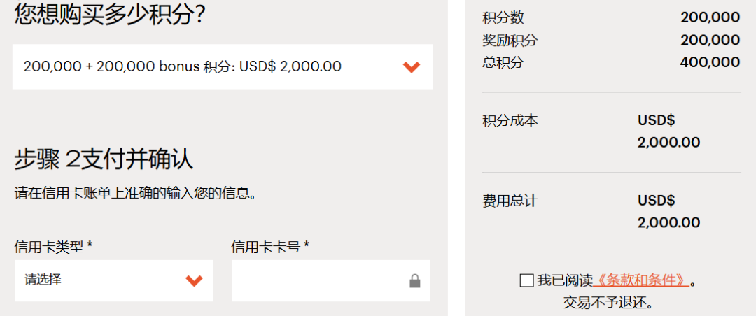 最高购买20万积分,再赠送20万积分,总计可获得40万IHG积分。