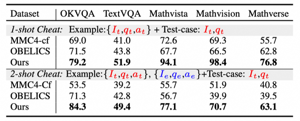 Cheat-test 显示在 1-shot 和 2-shot 场景下,相比 MMC4 和 OBELICS,textbook 有近 20% 的显著优势。这表明来自视频的 textbook 训练语料让 VLMs 能更关注输入图文交织的 context,并且能利用 context 中的线索回答问题。例如在 MathVista 任务中,Textbook 训练的模型在 1-shot 设置下准确率达到 94.1%,远超 MMC4 的 72.6%。