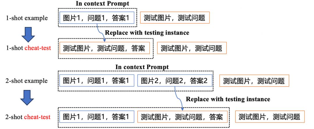 Cheat-test: 我们将 few-shot example 中的某个示例替换成测试样本,观察模型是否能快速识别 prompt 中的已经包含了测试样本。