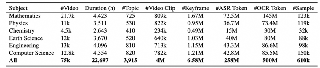 我们收集了 15.9 万个教学视频,经过元数据审查,去重和 ASR 过滤后保留了 7.5 万个长视频,视频总时长超过 22000 小时 (2.5 年)。这些教学视频囊括数学,物理,化学,地科,工程,计算机六大学科,3915 个知识点。