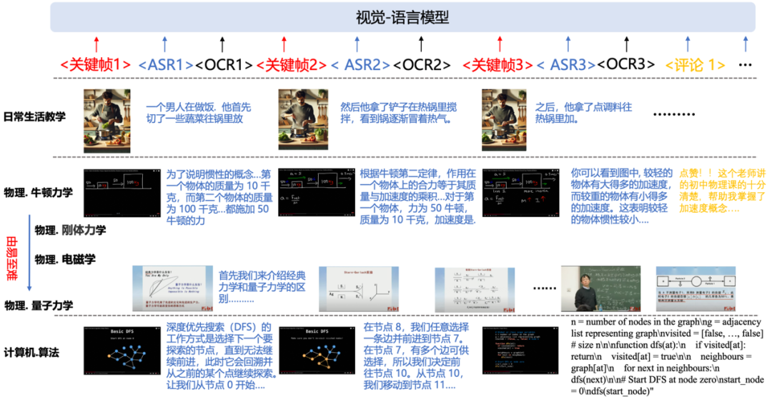 最后,我们将处理后的关键帧、OCR 文本和 ASR 转录按时间顺序排布,交错组织成多模态教科书。