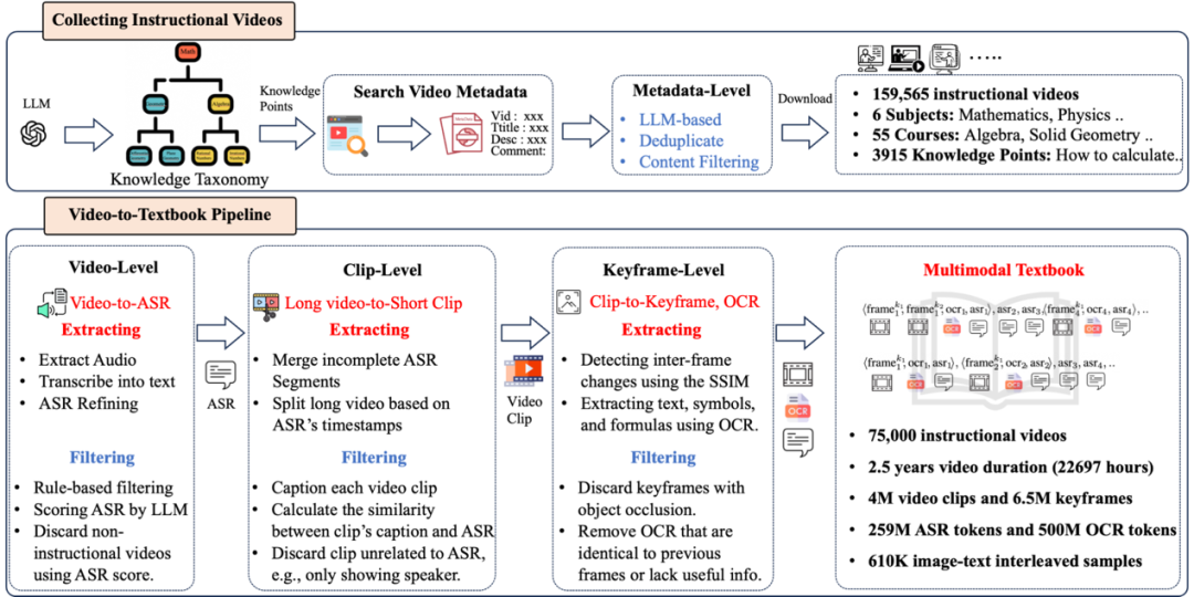 为了将教学视频转化为多模态教科书,我们设计了一个多层级的处理流程,包括 video-level、clip-level 和 keyframe-level,确保数据的高质量和知识的密集性。