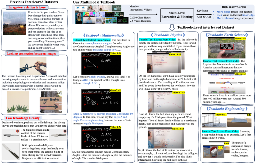 浙大和阿里达摩院从2.5年的教学视频中提取多模态语料,构建了图文并茂的教科书级数据集,显著提升了视觉语言模型的性能。