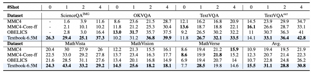 模型性能提升显著:在 Textbook-6.5M 上预训练后,LLaVA-1.5 和 Idefics-8B 在多个基准上表现出显著改进。在 0-shot 到 4-shot 设置下,分别提升了 +3.2%、+8.3%、+4.0% 和 +4.6%。即使对于像 Idefics2 这样的原本支持图文交织输入的 VLM,该 textbook 仍带来了额外 +1.4% 的提升,突出了其丰富的知识内容和高数据质量。