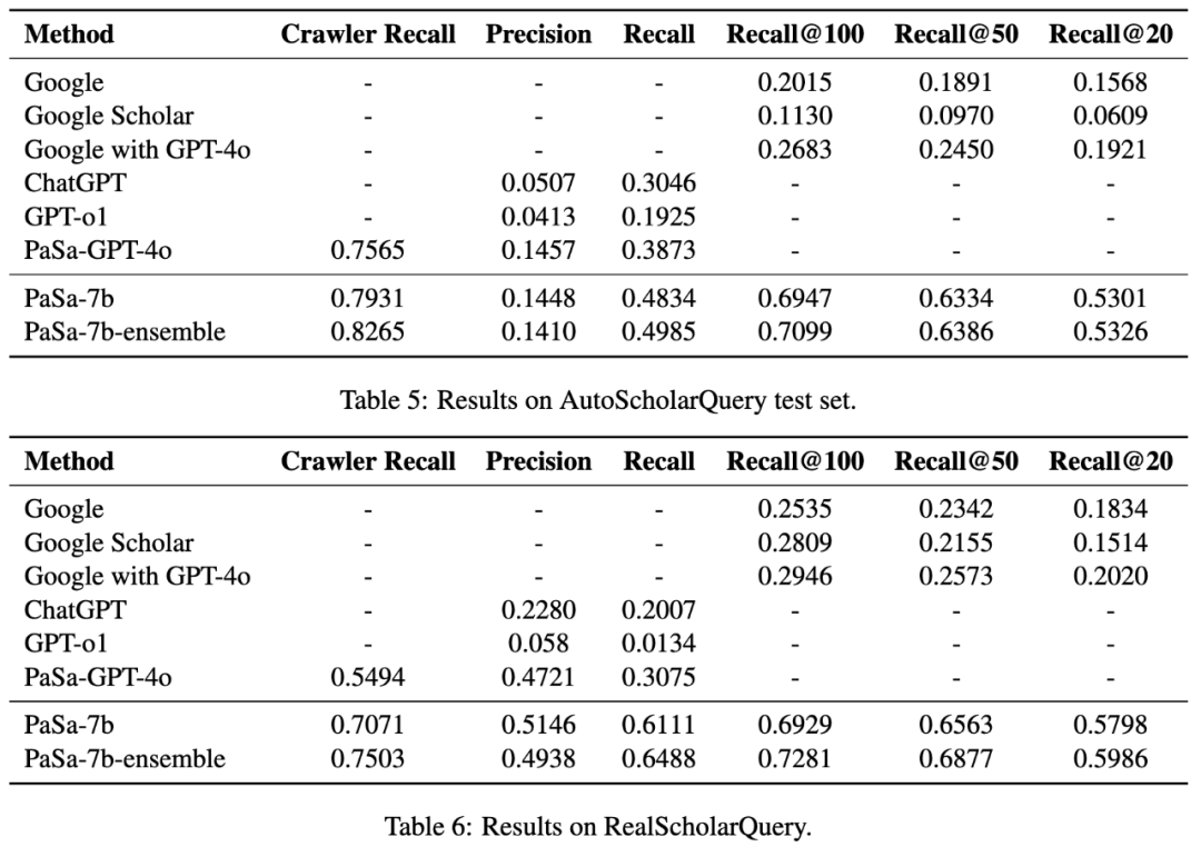 在更接近真实的 RealScholarQuery 上,PaSa-7b 的提升更加明显。与 PaSa-GPT-4o 相比,PaSa-7b 的召回率提高了 30.36%,精确率提高了 4.25%。Google 搜索的最好结果相比,Recall@20,Recall@50 和 Recall@100 分别提升了 37.78%,39.90% 和 39.83%。PaSa-7b-ensemble 的召回率和 Crawler 召回率分别进一步提高了 3.52% 和 4.32%。