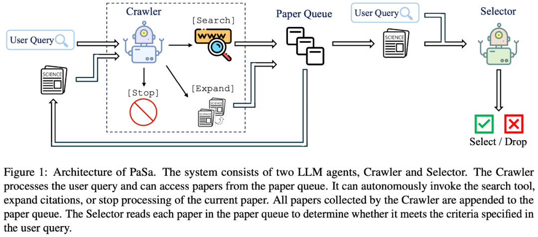 PaSa 的核心组件包含两个 LLM Agents:Crawler 和 Selector。Crawler 通过自主调用搜索工具、阅读论文、扩展参考文献,不断收集与用户 Query 可能相关的学术论文。Selector 则负责精读 Crawler 找到的每一篇论文,决定其是否满足用户的需求。